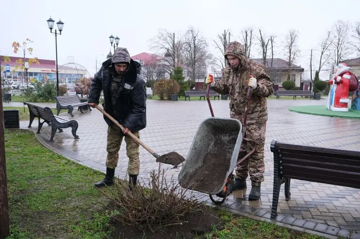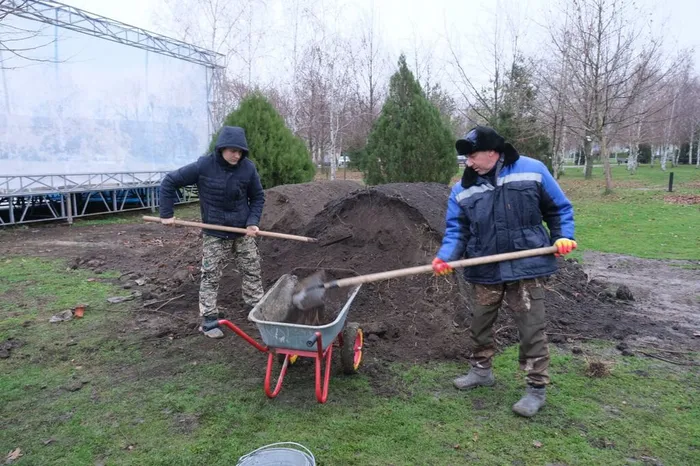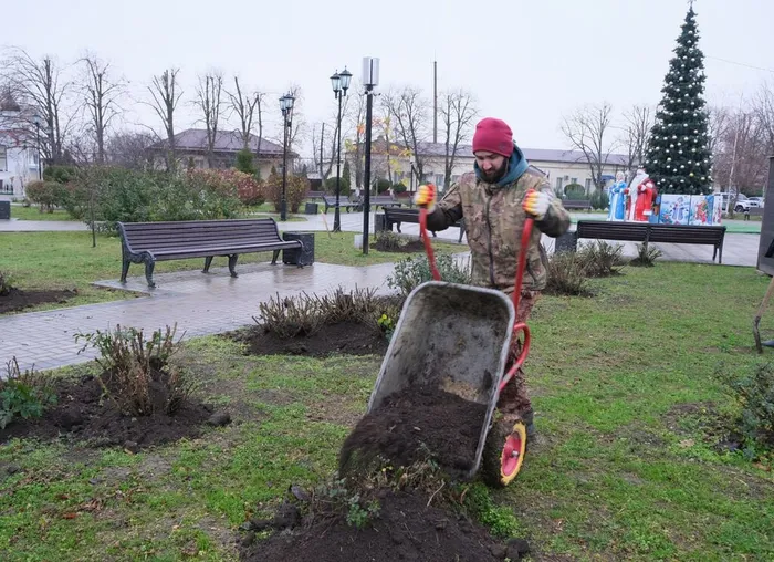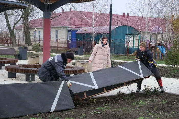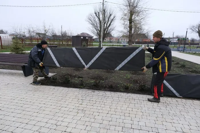 Бригада по благоустройству МКУ МТО нашего сельского поселения укрывает растения в парках и скверах от зимних морозов.