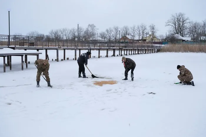 Сегодня у сотрудников МКУ был дополнительный график - по водоемам. Прорубили лед, расчистили снег, рассыпали корма.